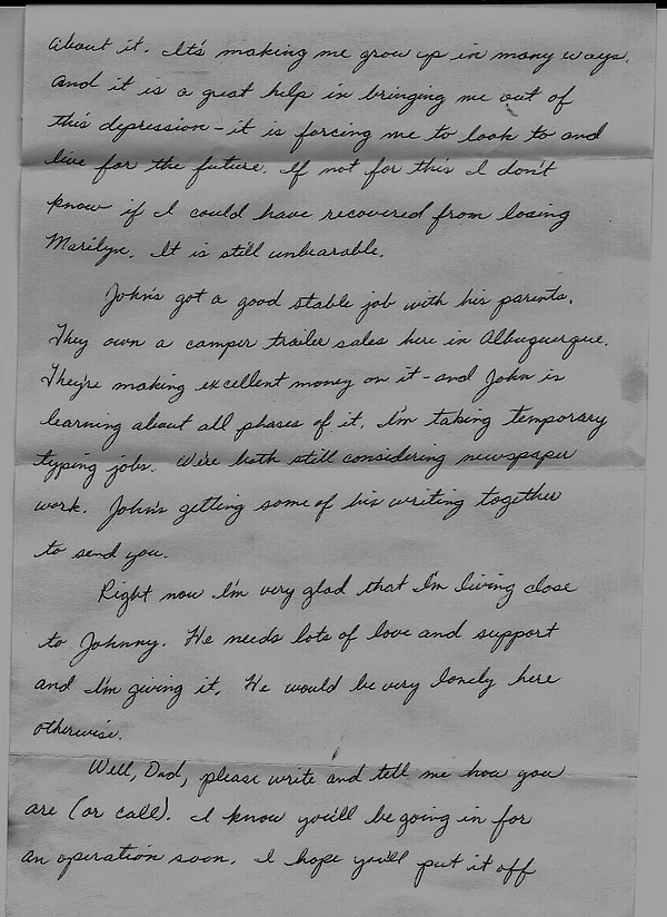 While organizing a lifetime of paperwork for my 85 year old father, who was suffering from alzheimers, I was shocked to discover he’d saved two letters that were written to him, shortly after the suicide of his daughter, Marilyn. He had kept the two letters in pristine condition, neatly folded and stored in their original envelopes, tucked deeply away where our stepmother could not get to them. She liked to throw our pictures out, or bury them under silverware trays, and drawers filled to the top with craft magazines, I discovered after her death. She displayed pictures of her niece and family, in frames about the house, and stuffed away all the pictures that anyone from Dad’s children had sent. I saw large pictures of my nieces, 5X7, maybe larger, all hidden beneath a pile of magazines.