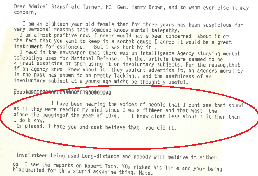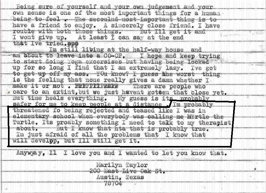 There was another witness through those years that informed me many years after the fact. In that box I found a number of letters, and even a telegram, that Marilyn had written to President Carter, the FBI, a handful of generals in charge of military experiments. She explained to them that she was hearing voices and asked them why they had used her in their experiments. She was angry with them. Some of those letters she signed as “Myrtle the Turtle”.