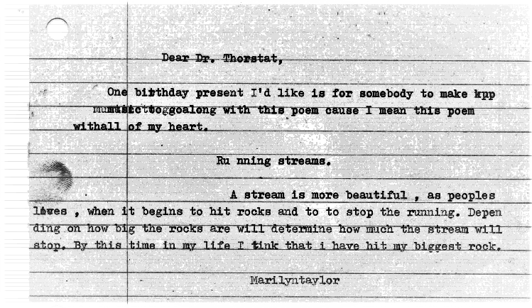 Marilyn never told me, or anyone, that this was going on in her elementary school. She did not start writing about it until a few months before her suicide.
