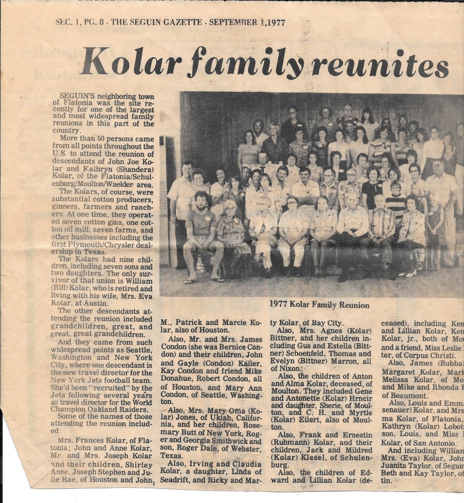 The cotton gin was a large cavernous structure that had been abandoned long before I got there, with ladders that led to the rooftop, and huge broken shafts and spindles, leaning against walls, wedged so firm we could climb upon them. There was something haunting and spooky about the place and I don’t recall wanting to return after a few explorations. But it wasn’t until I was sitting in my college history class, 35 years later, that it dawned on me what all of that property of my grandfather’s represented. And sure enough, when I looked it up on the internet, the Kolar family was in the cotton gin business from earliest days, which means there were slaves in the history.